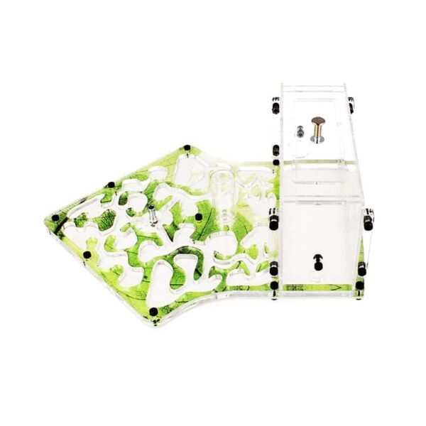 Муравьиная ферма имеет стильный дизайн. На объёмной арене удобно кормить муравьёв и убирать. Сбоку есть специальное отверстие для подключения пробирки, это поможет заселить ферму, не используя никаких переходников. Также есть дополнительное отверстие для переселения колонии в другой формикарий или расширения существующего. Подробнее описано в инструкции. Вы можете разместить на арене разные декорации — песок, веточки, камни, цветы.