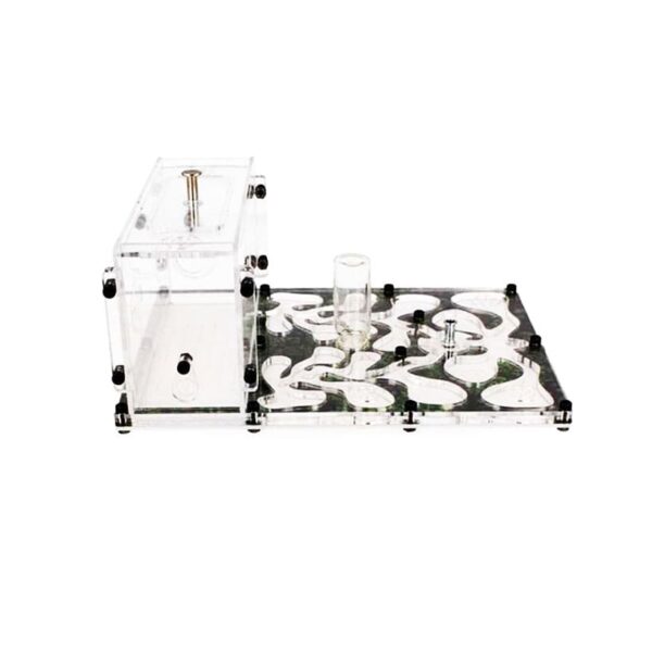 Муравьиная ферма имеет стильный дизайн. На арене удобно кормить муравьёв и убирать. Сбоку есть специальное отверстие для подключения пробирки, это поможет заселить ферму, не используя никаких переходников. Также есть дополнительное отверстие для переселения колонии в другой формикарий или расширения существующего. Подробнее описано в инструкции. Вы можете разместить на арене разные декорации — песок, веточки, камни, цветы.
