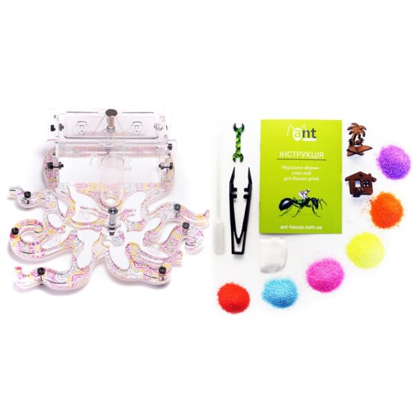 Муравьиная ферма «Kraken mini»— имеет стильный дизайн. На арене удобно кормить муравьёв и убирать. Сбоку есть специальное отверстие для подключения пробирки, это поможет заселить ферму, не используя никаких переходников. Также есть дополнительное отверстие для переселения колонии в другой формикарий или расширения существующего. Подробнее описано в инструкции. Вы можете разместить на арене разные декорации — песок, веточки, камни, цветы.